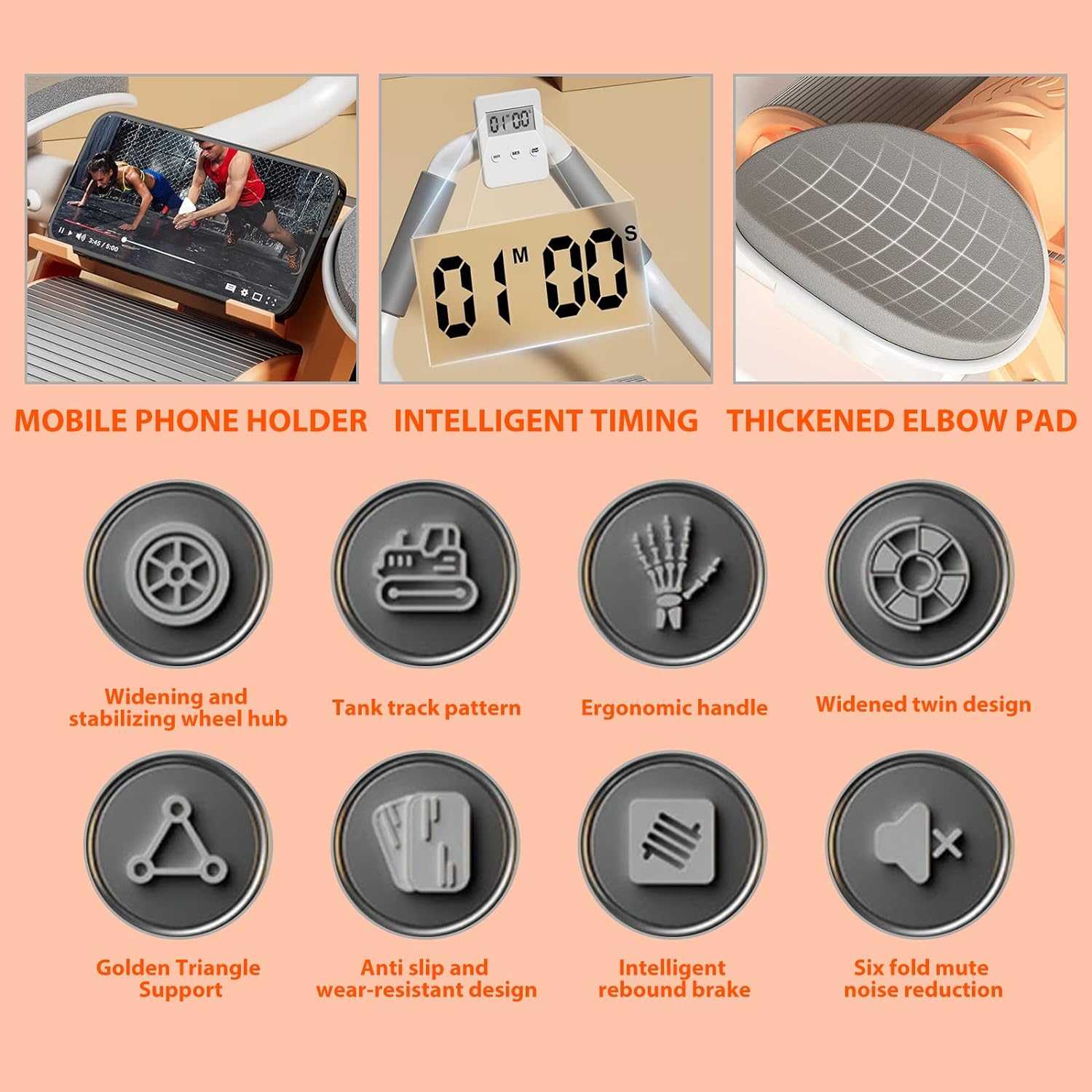 Elbow support ab roller features intelligent timing, phone holder, thickened elbow pad, and anti-slip design for effective abs workout.