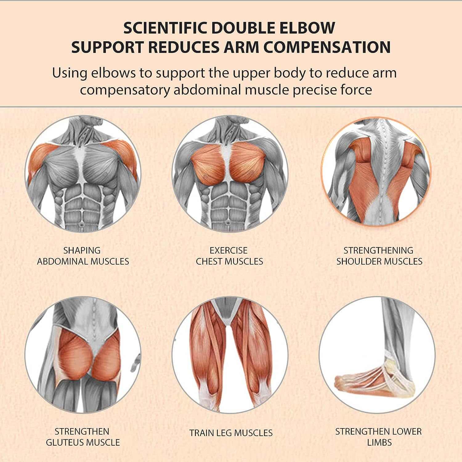Elbow support for reduced arm compensation, featuring abdominal, chest, shoulder, gluteus, leg, and lower limb muscle exercises.