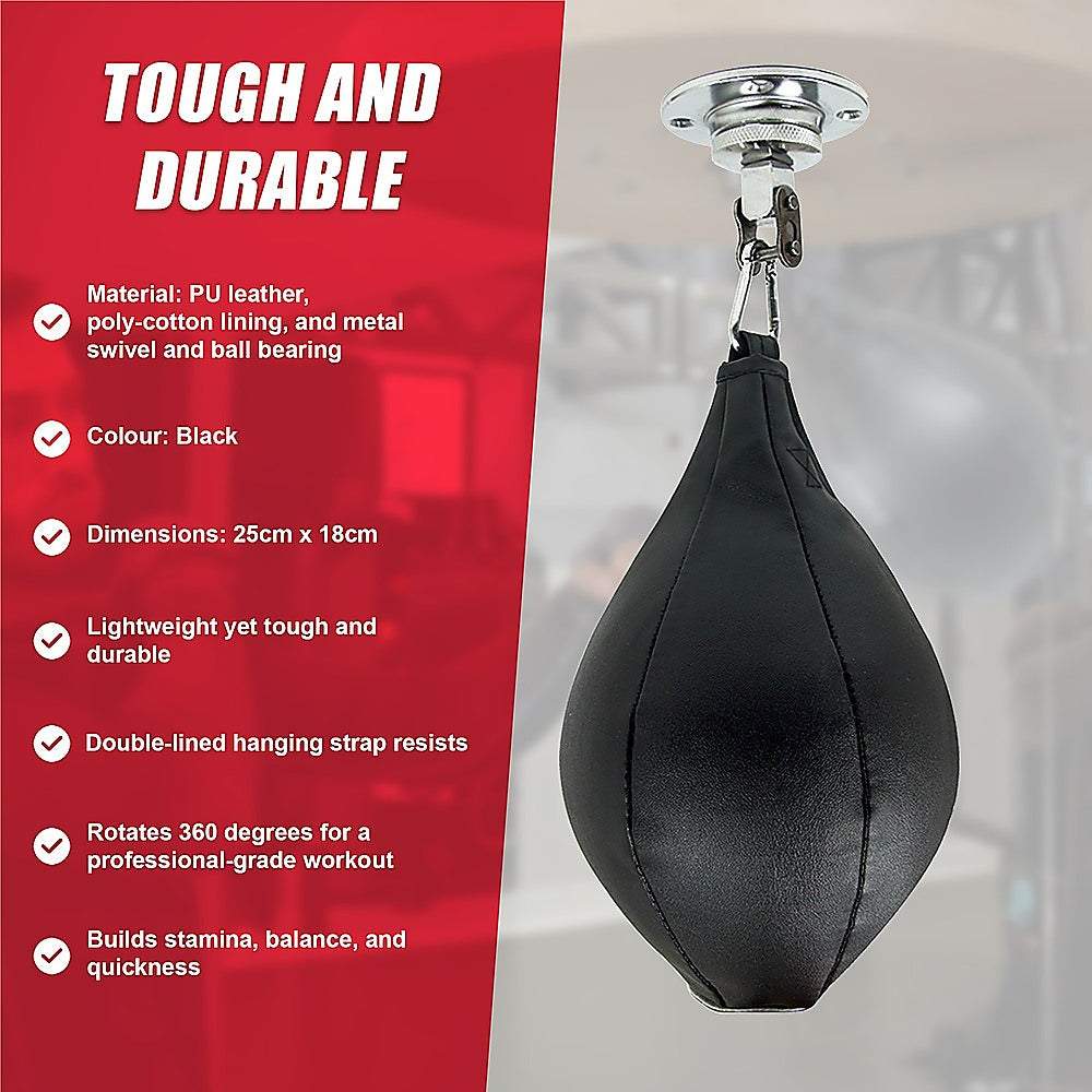 Black PU Leather Boxing Speed Bag for MMA and Muay Thai Training, 360-degree rotation, durable poly-cotton lining, professional-grade.
