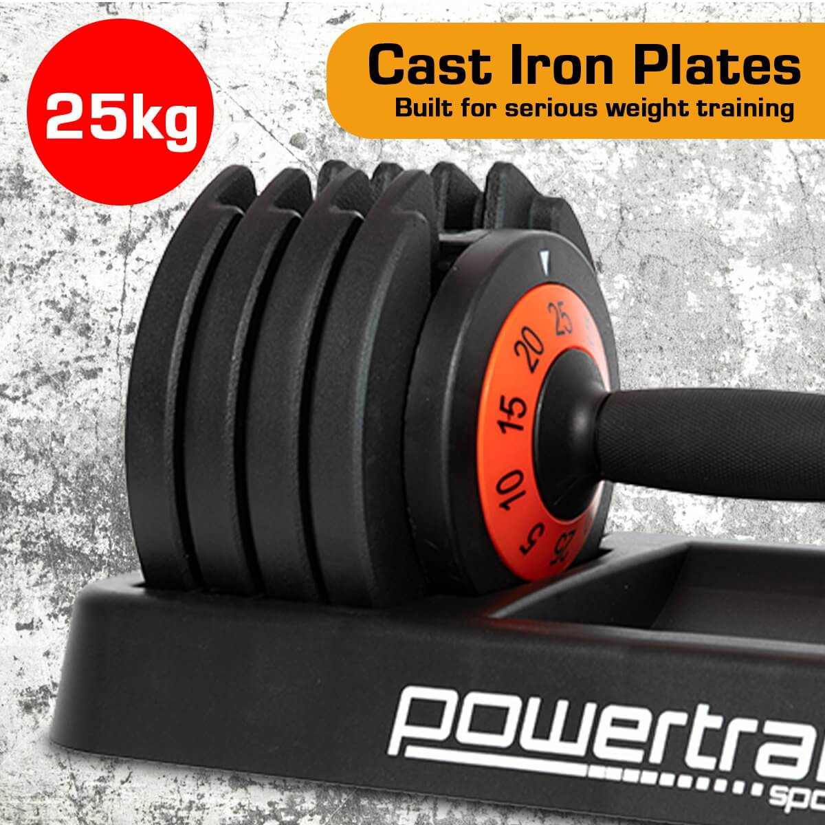 You don't need 5 sets of dumbbells to reach your fitness goals. The Powertrain GEN2 Pro adjustable dumbbell set has a total weight of 50kg (25kg per dumbbell), allowing you to work out efficiently at home. Get gains faster without cluttering up your home gym.