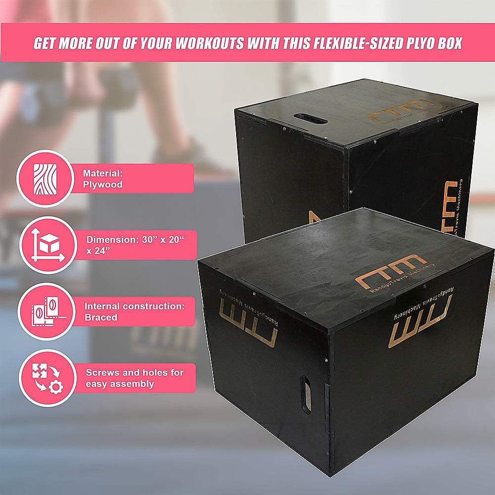 Gain more height and explosiveness using Randy & Travis Machinery's versatile three-in-one plyometric box to train your vertical leap. Turn the box three ways to start small and work your way up to a full 30 inches. Set it up with the large base at the bottom, and you'll have a 20-inch platform. Set it up with the medium base, and it's a 24-inch platform. Use the smallest base, and you'll have a full 30-inch-high platform to train on.