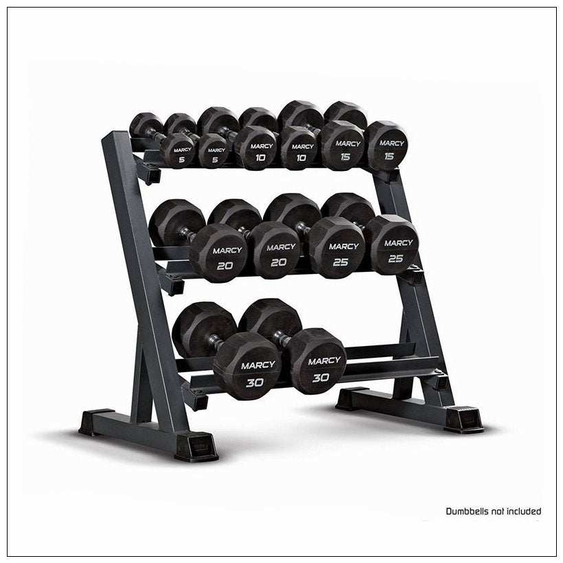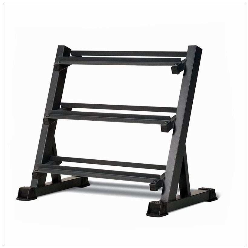 3-Tier dumbbell holder rack with heavy-duty welded steel construction and space-saving design.