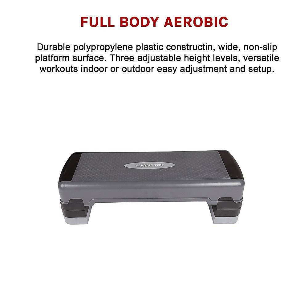 Adjustable Aerobic Step with non-slip surface, durable construction, and 3 height levels for gym exercise fitness workouts.