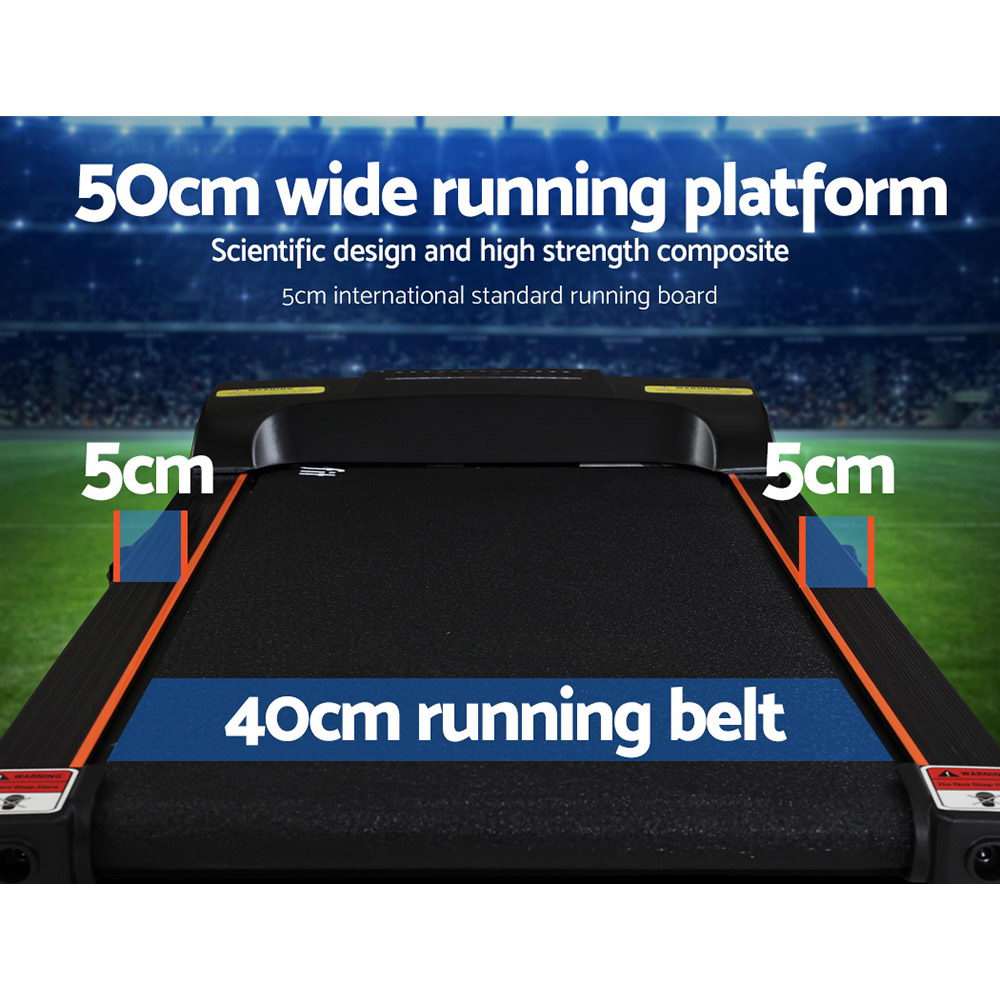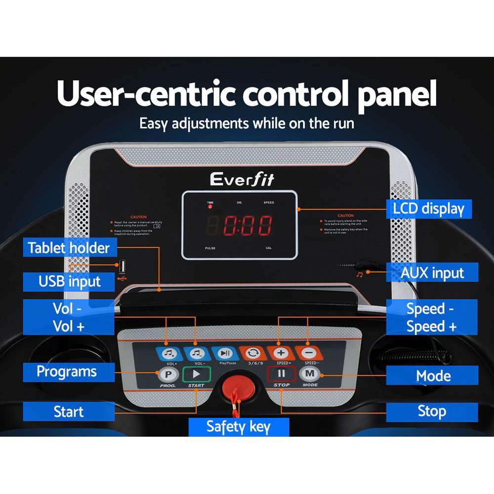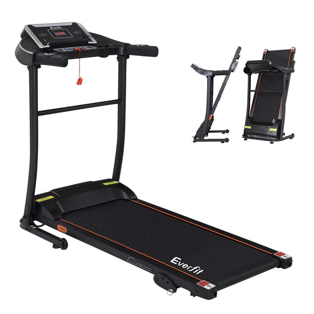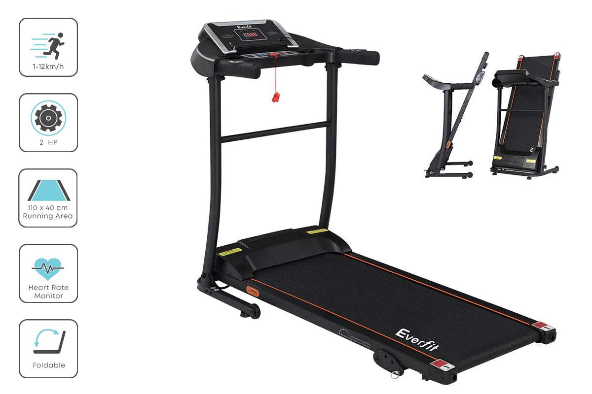 For a truly effective approach to weight loss and toning, our Everfit Electric Treadmill is your perfect companion. Compact and sturdy with its powder-coated steel frame, the treadmill allows you to perform essential cardio exercises within the comfort of your home. It features 12 pre-set training programs designed to simulate natural terrain. A user-centric control panel with a digital LCD display lets you set up to speeds between 1km/h and 12km/h and other monitoring parameters. Its powerful motor produces smooth and seamless operation and the anti-slip belt and soft-grip handlebar with pulse sensors make your session a comfortable and controlled experience. Other great features include a 3-level manual inclination adjustment, safety tether key, foldable design for easy folding and storage, and smooth wheels for easy mobility. Not least, the treadmill is also equipped with MP3 connection, speaker output and dual drink holders to keep you both entertained and hydrated. For health results that matter, our Everfit Electric Treadmill is the one to run to. Get yours today.