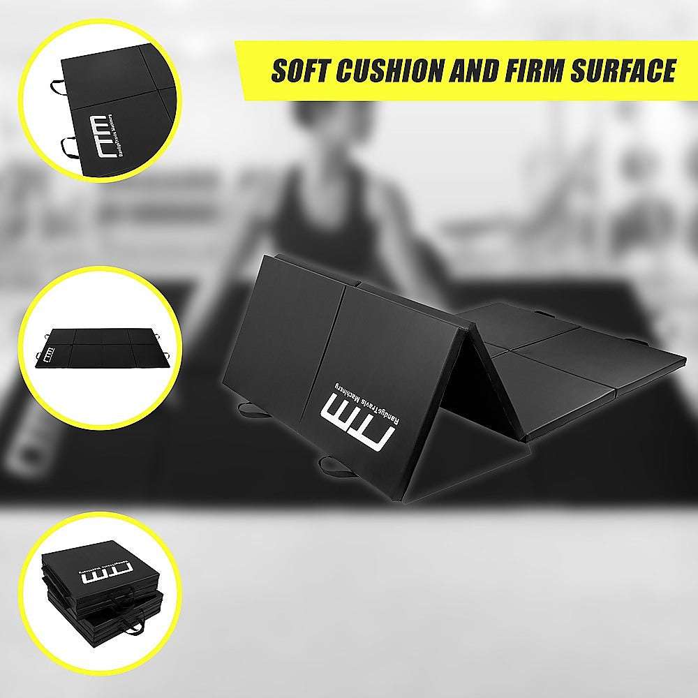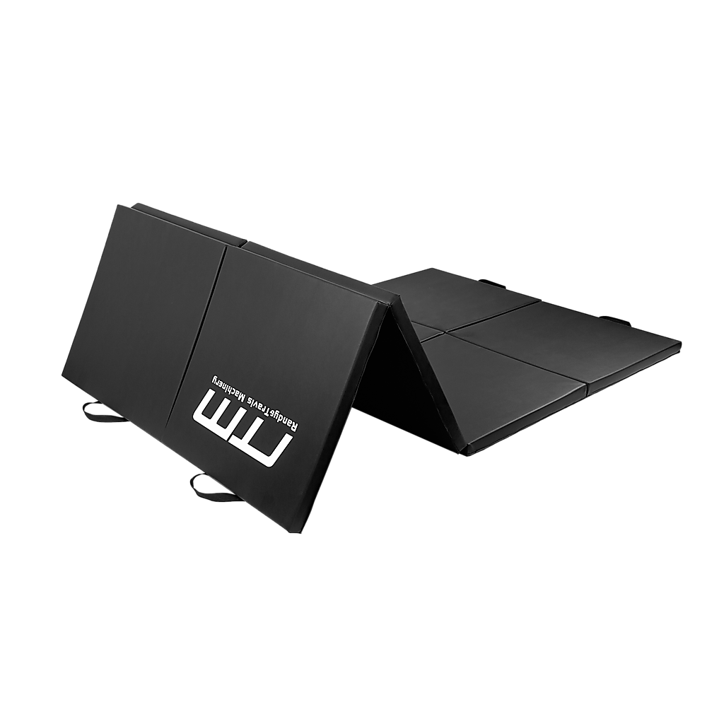 Black foldable exercise mat for gymnastics, martial arts, and yoga, featuring a soft cushion and firm surface.
