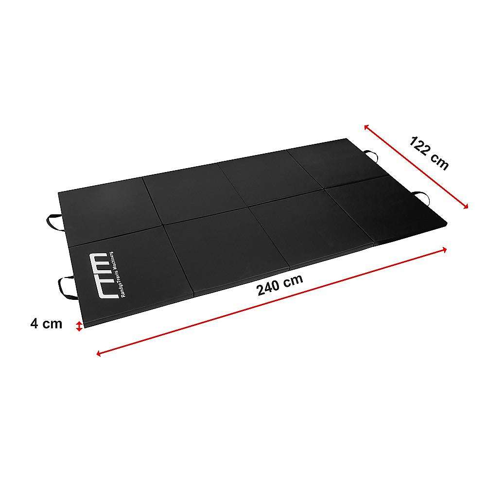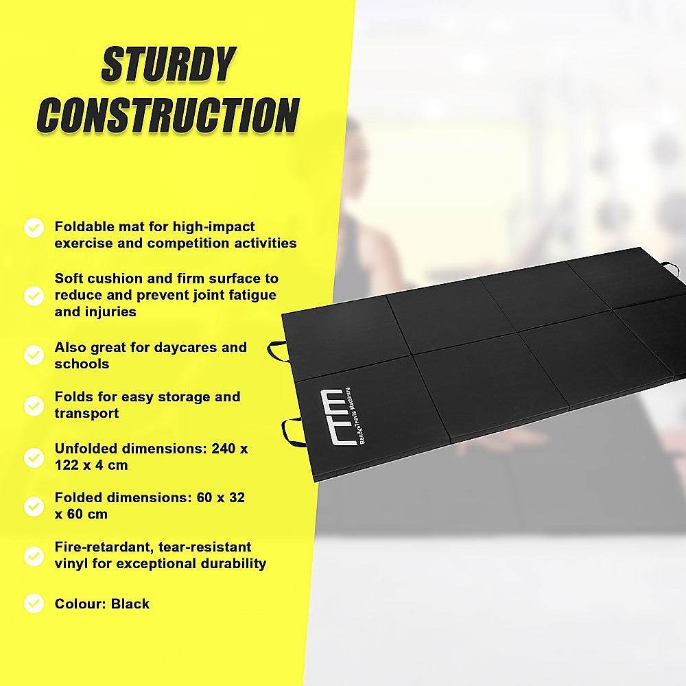 Black folding exercise mat for gymnastics, martial arts, yoga, karate, and judo with dimensions 240 x 122 x 4 cm.