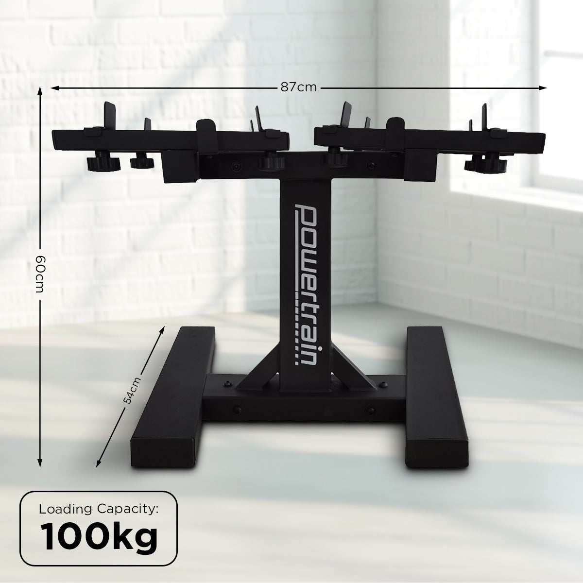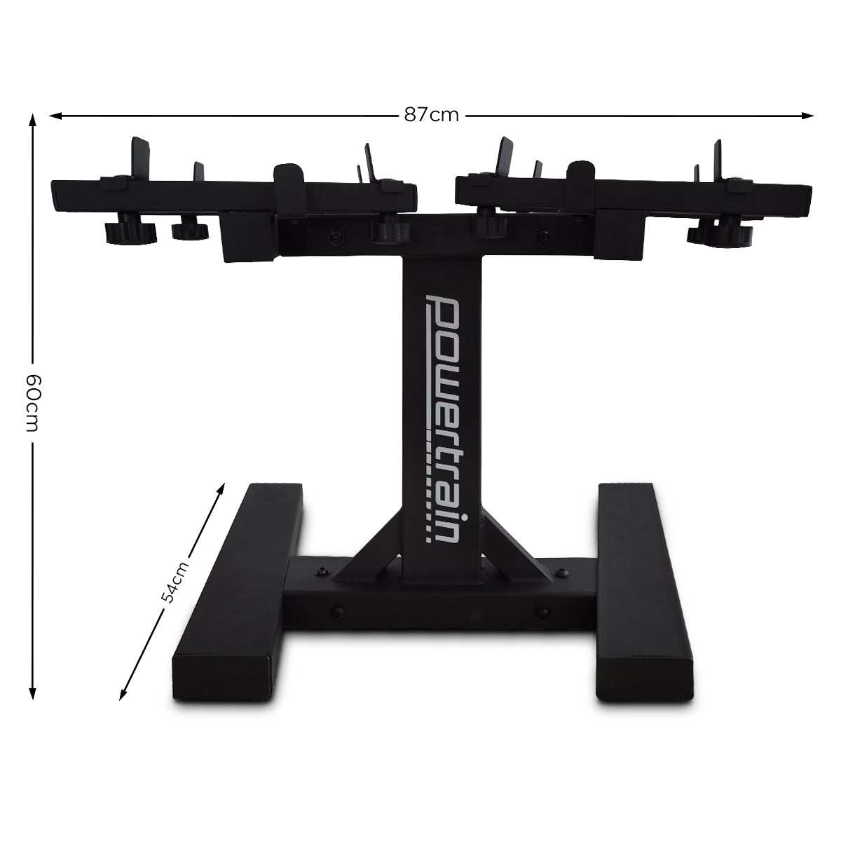 Powertrain Adjustable Dumbbell Stand GEN2 Pro with ergonomic design, heavy-duty construction, 100kg capacity, dimensions 87x54x60cm.