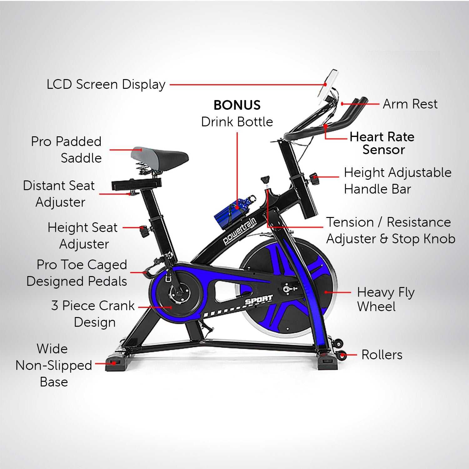 Blue Powertrain home gym flywheel exercise spin bike with LCD display, adjustable seat and handlebars, non-slip grip, and water bottle holder.