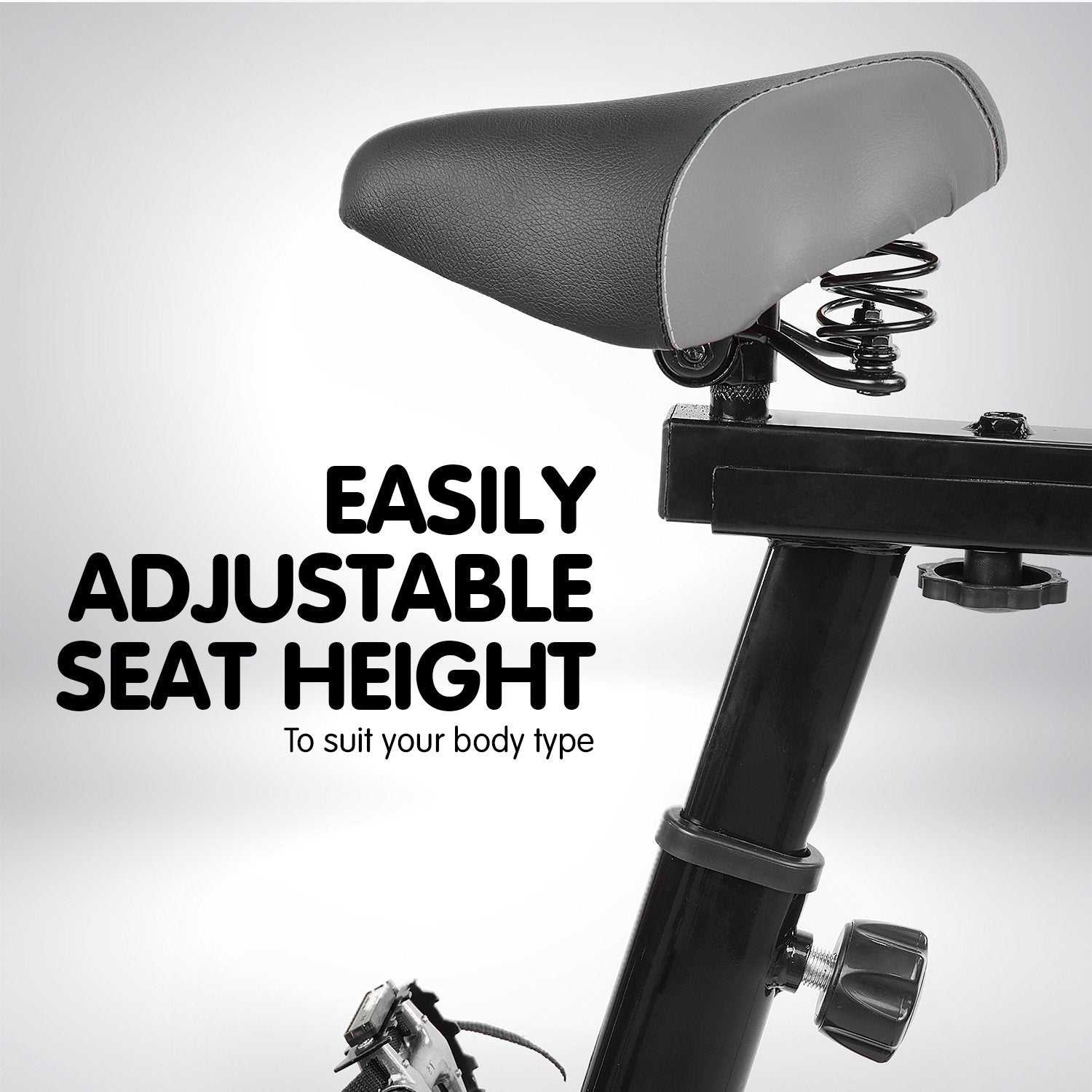 Easily adjustable seat height feature on the Powertrain Home Gym Flywheel Exercise Spin Bike - Blue.