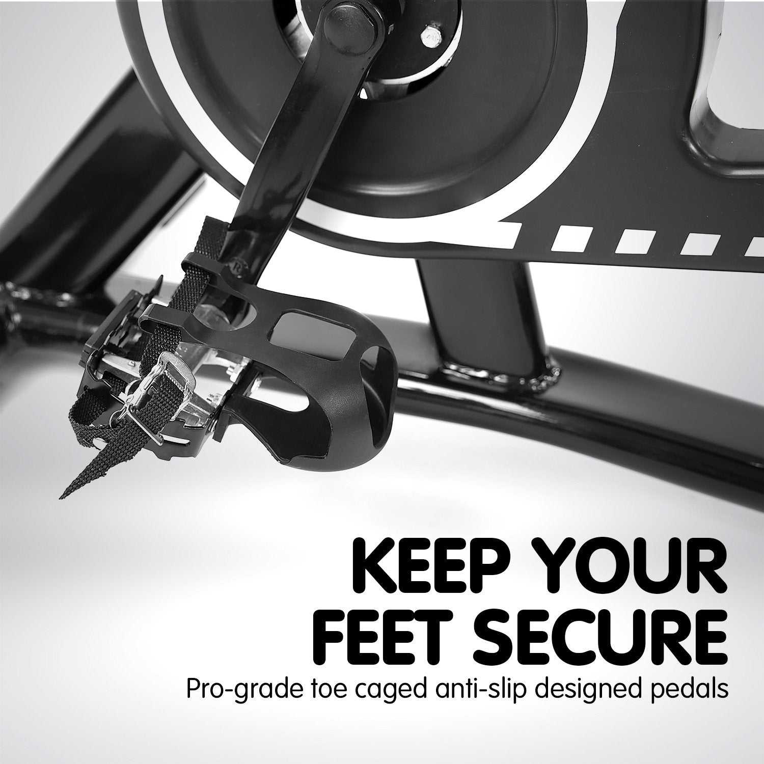 Powertrain Home Gym Flywheel Exercise Spin Bike - Blue with pro-grade toe-caged anti-slip pedals.