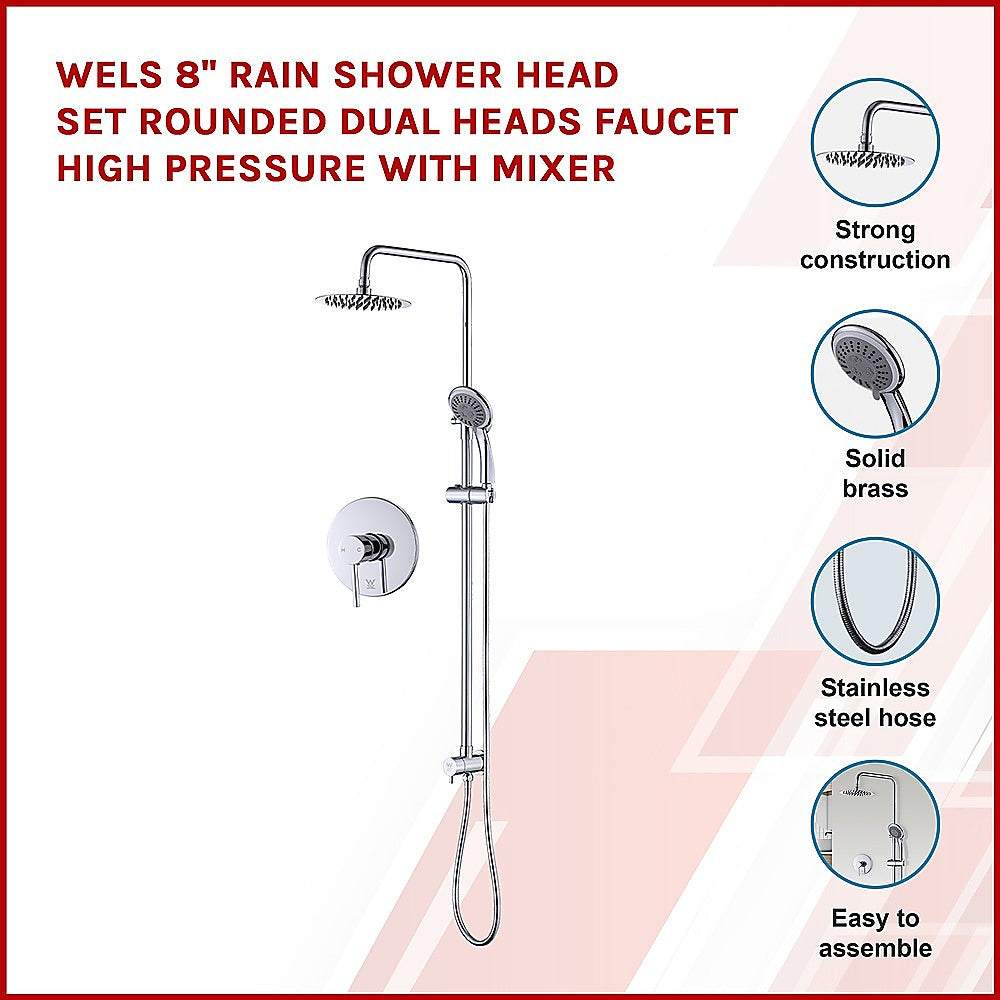 WELS 8" rain shower head set with rounded dual heads and high-pressure faucet in chrome finish.