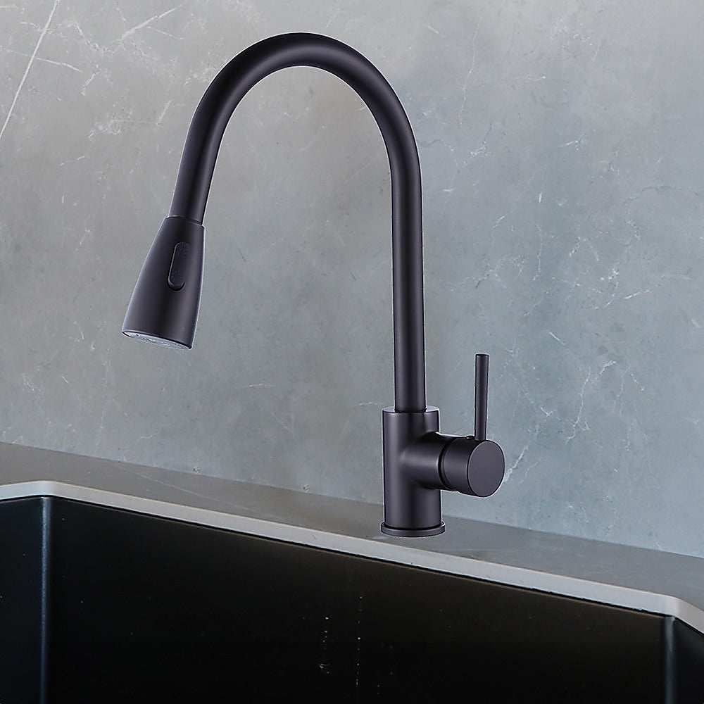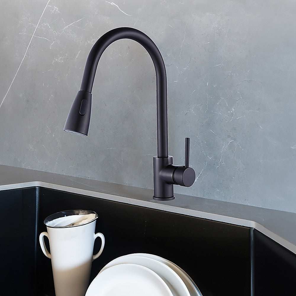 Matte black pull-down mixer tap faucet for kitchen, laundry, and bathroom sinks.
