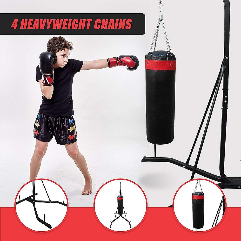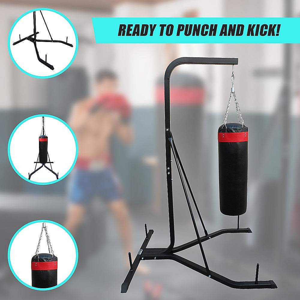 The punch bag stand features dimensions of 218 x 165 x 165cm (H x D x W). It features an all-steel frame for exceptional durability and stability. Assembly is straightforward, and everything you need is included.