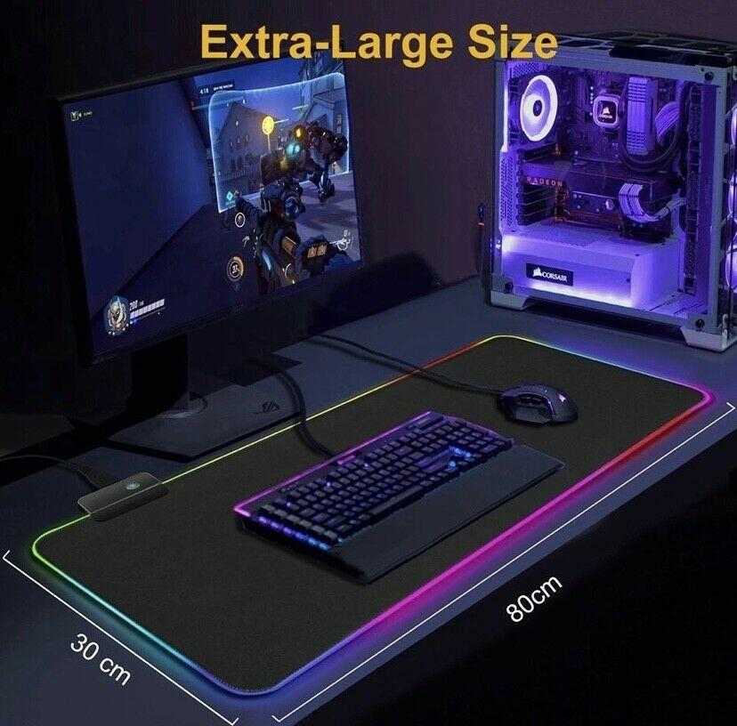 LED gaming mouse pad with RGB lighting effects, extended mat for keyboard and desk, anti-slip design for enhanced gaming experience.